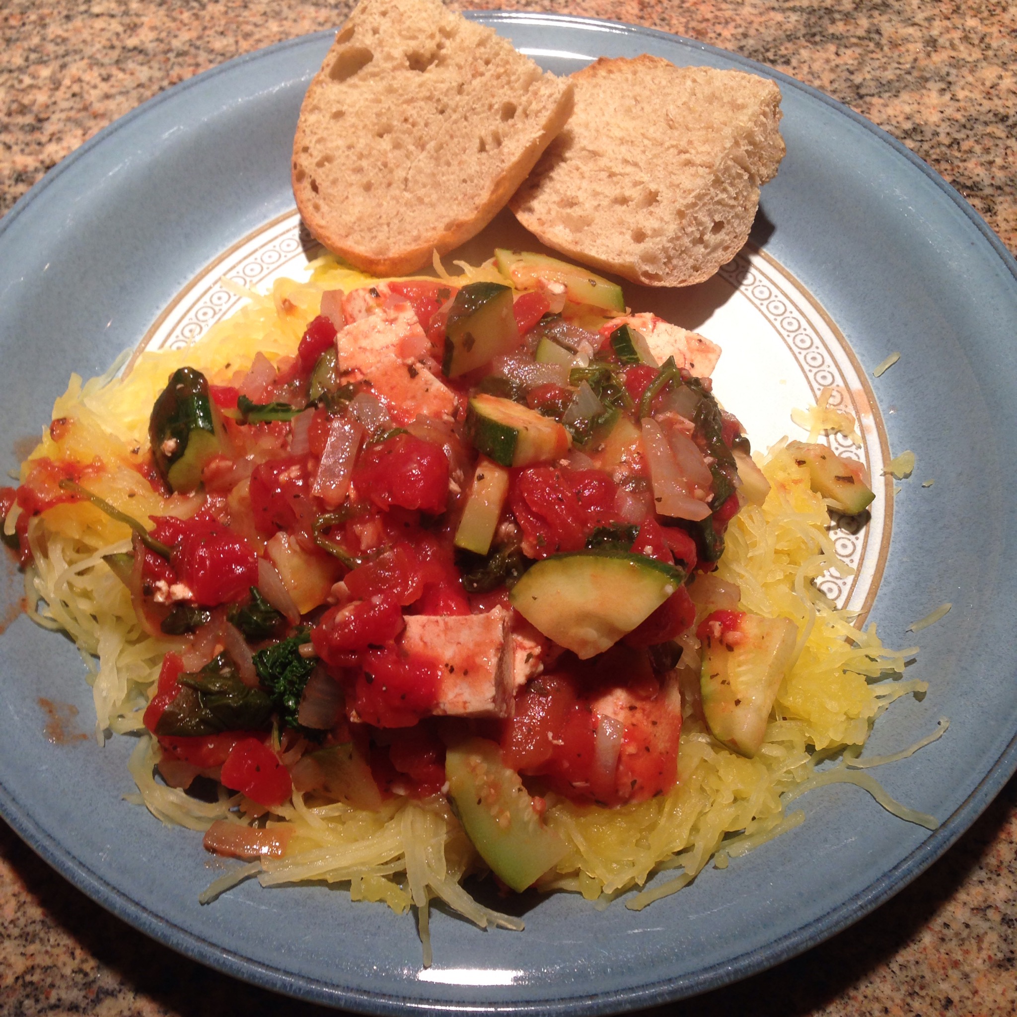 Here’s my finished plate! I served it over spaghetti squash with a little wheat bread on the side. It was really good…