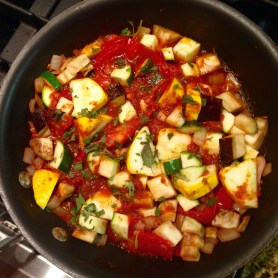 - Add canned tomatoes, onion, garlic, rosemary, eggplant, oregano and sliced roma tomatoes.