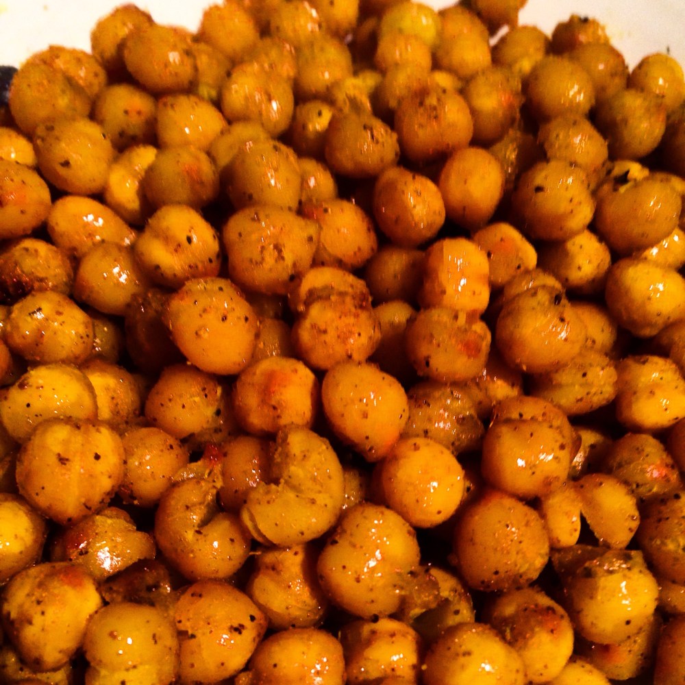 - Remove chickpeas from oven when they are crunchy, give a little spray of olive oil then add the rest of the curry mixture onto the chickpeas. Shake around to evenly disperse. Let cool for about 10 minutes, then enjoy!