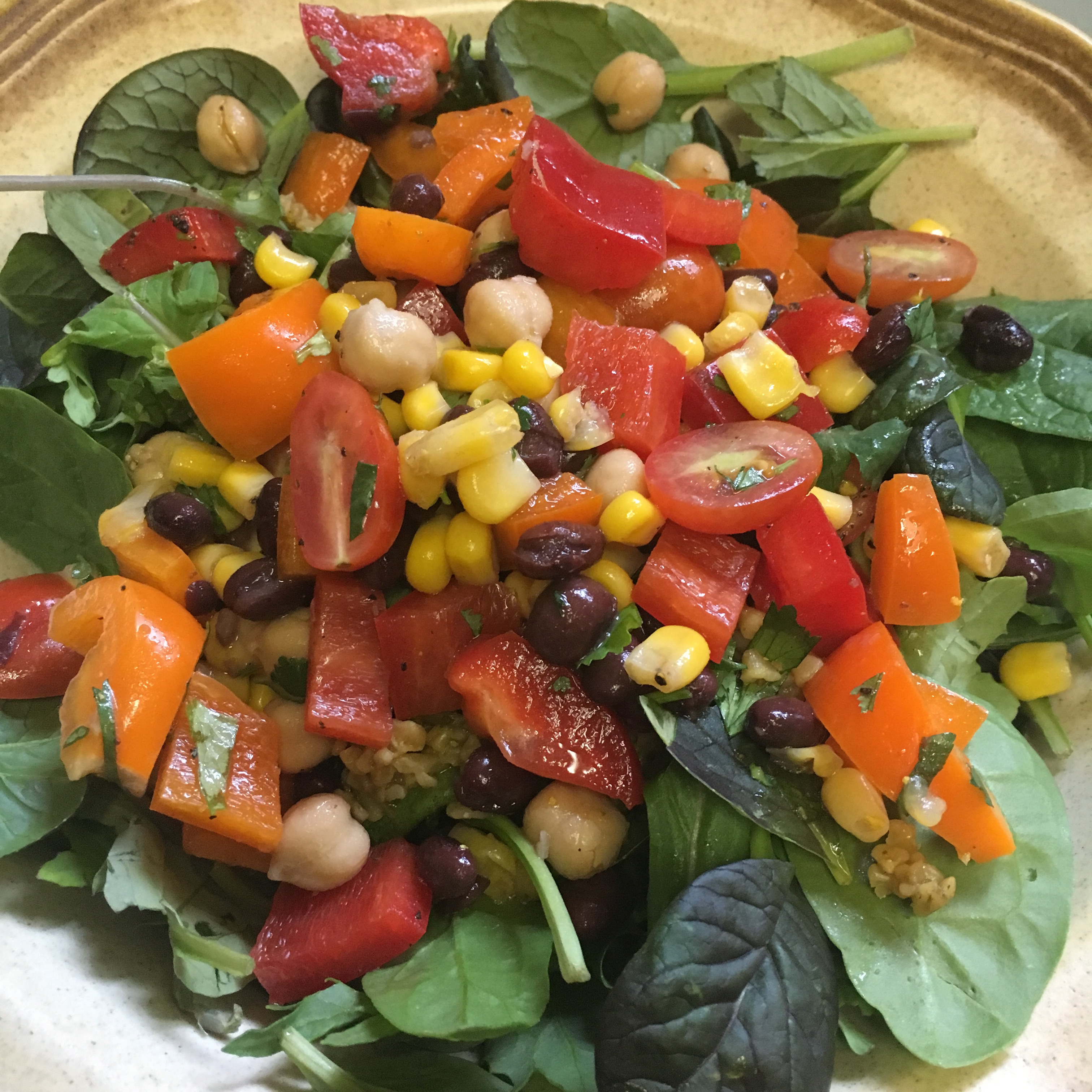 Here’s what I used dressing on tonight. Mixed greens, chopped bell peppers, halved cherry tomatoes, corn, garbanzo beans, black beans and more cilantro