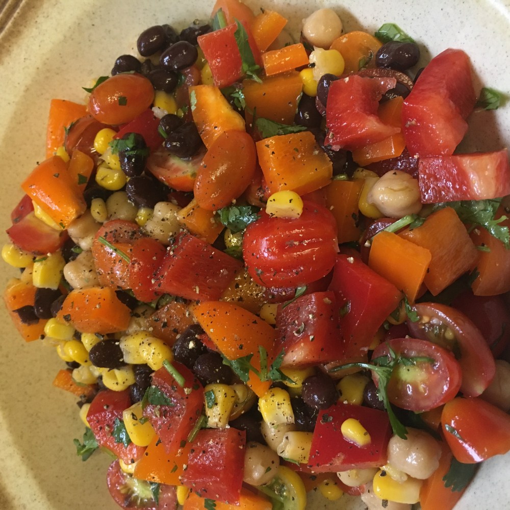 Here is a mixture of black beans, garbanzo beans, corn, bell peppers, cherry and roma tomatoes tossed in my cilantro lime vinaigrette. Highly recommended for any pot-luck, on top of a bunch of greens, or a great make a ton of on Sunday for the week recipe.