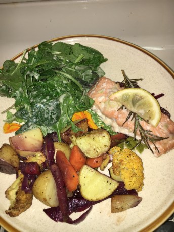 I bought a whole bunch of potatoes, carrots, and cauliflower and my typical go to) is roasting them. Because roated vegetables are amazing. I’d also been craving salmon, so purchased sustainable frozen salmon, and let it thaw in the fridge all day. Wondering how to combine the two, I thought, why not just make one ‘roasted’ dish with these guys and literally cook them combined?