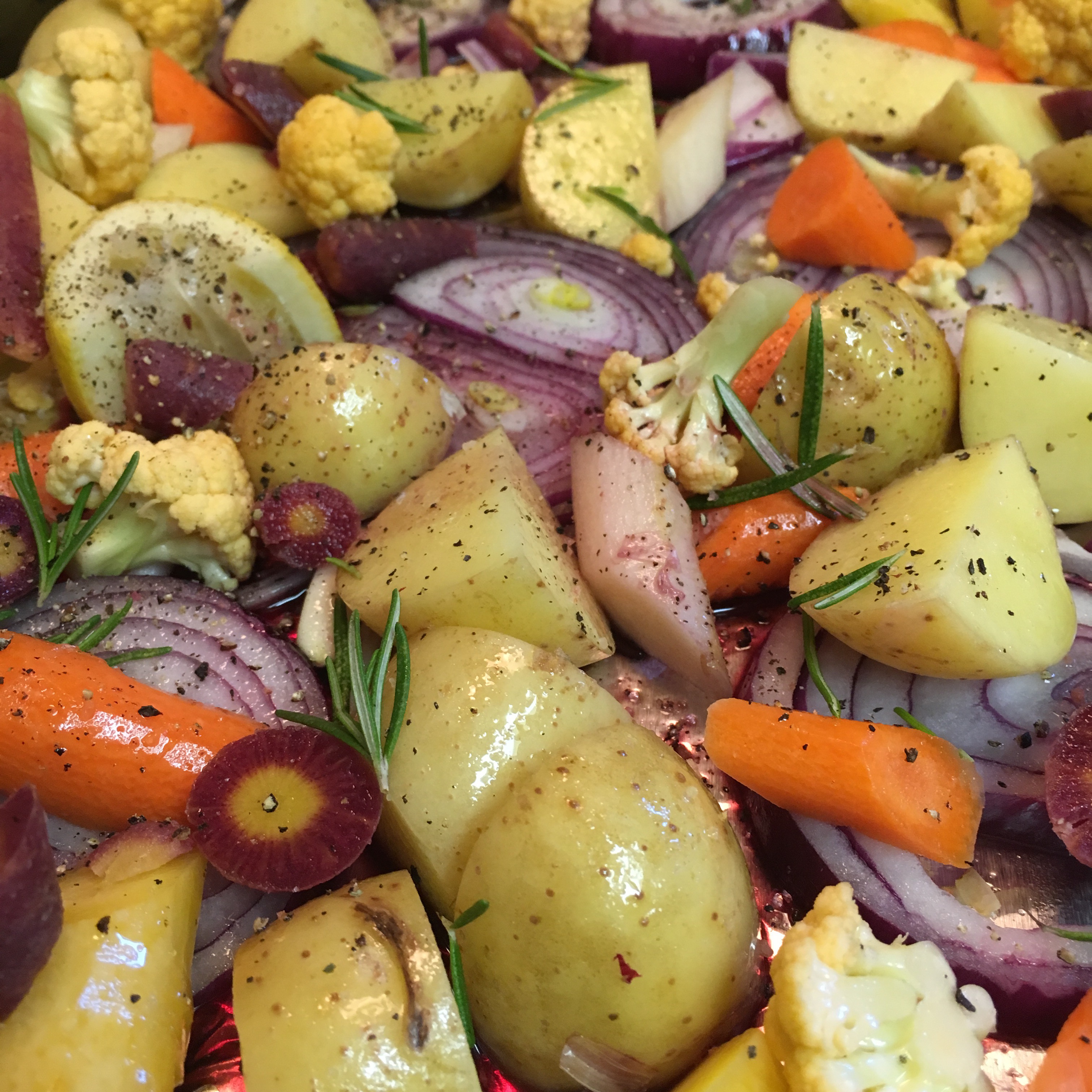 - On a large baking sheet, place potatoes, carrots, cauliflower and onion. Spray with olive oil and season with spray, 1Tbsp rosemary, 1/2 of garlic, salt and pepper. Stir to combine. Bake for 25 minutes.