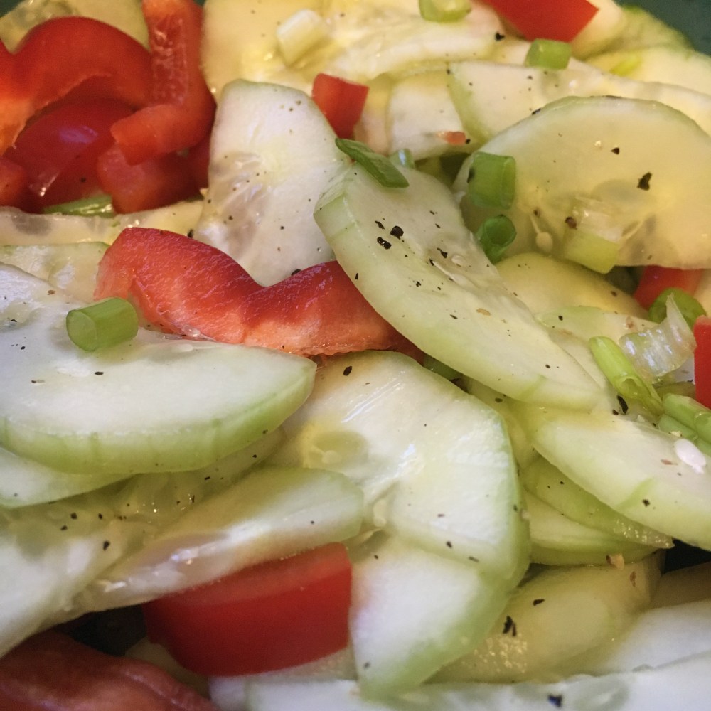 - In a medium bowl, add cucumbers, bell peppers and green onion and toss.