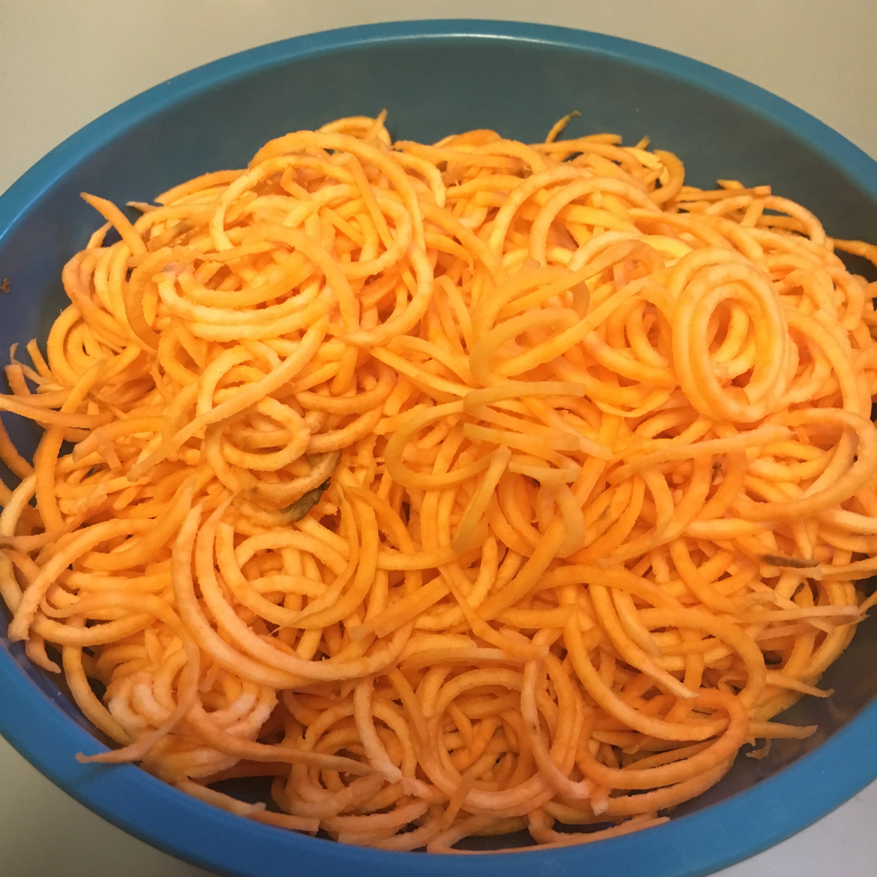 - With a spiralizer, make noodles with our sweet potatoes. (You may also use a julienne peeler, but will take more time)