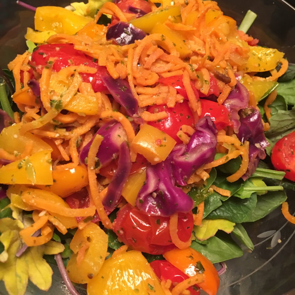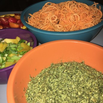 I recently made some fabulous pesto and needed some ideas of what to put it on! First thought, zucchini noodles. Second thought…I purchased a huge bag of sweet potatoes, because…you know, they’re good. I had never made any sweet potato noodles before, and figured this would be the perfect pairing! This dish was definitely a hit. The beautiful colors made the amazing taste even that much better. I hope you enjoy!