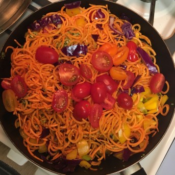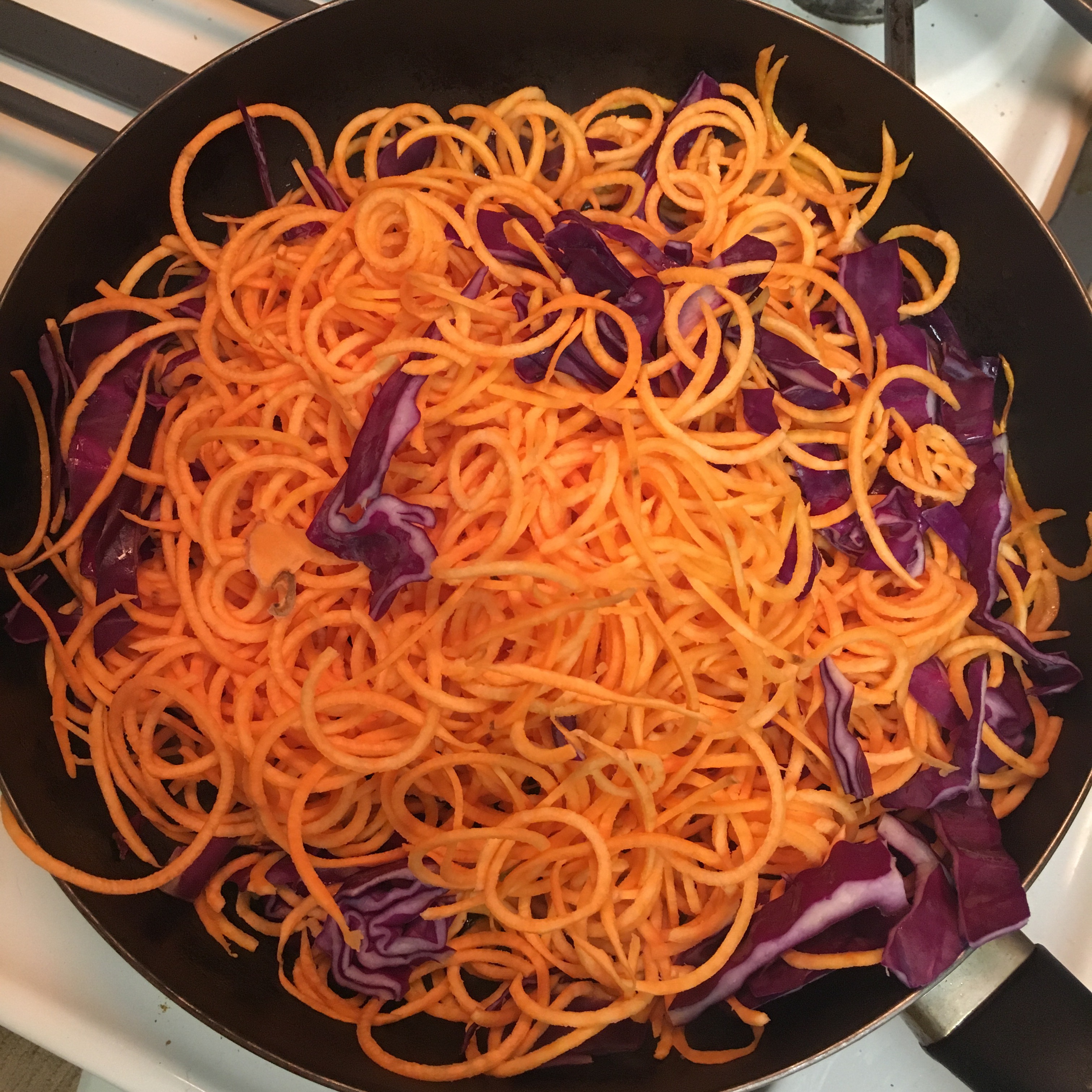 - When coconut oil is hot, add sweet potato noodles, bell peppers and cabbage to the pan. Toss with tongs to coat the vegetables