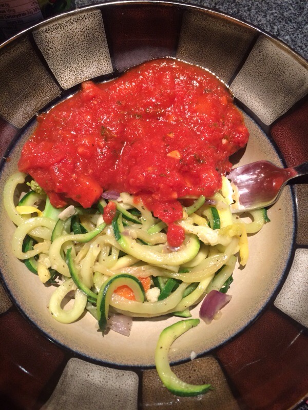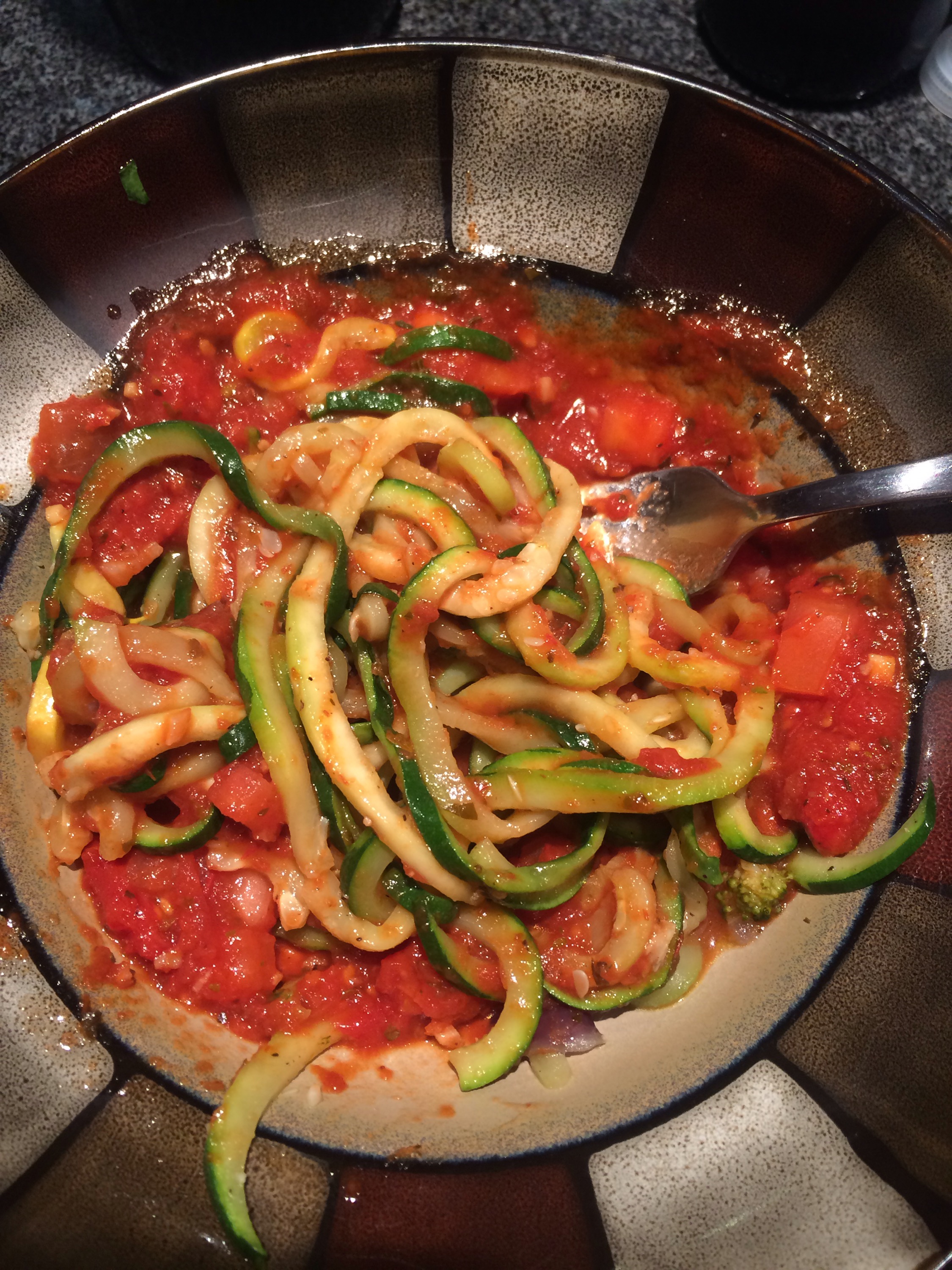 What was made? My friends made zucchini noodles with extra broccoli, with a semi-homemade tomato sauce.
